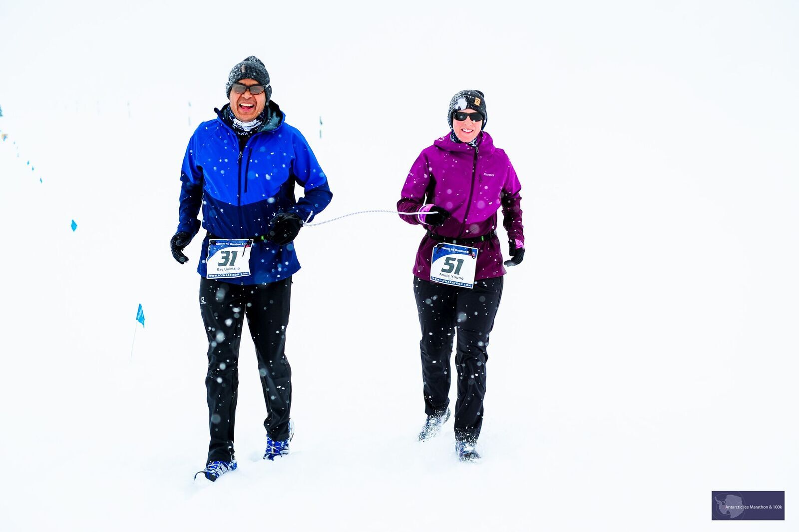 Running the 2018 Antarctic Ice marathon, Annie’s husband Ray uses a rope to guide Annie thru the course.