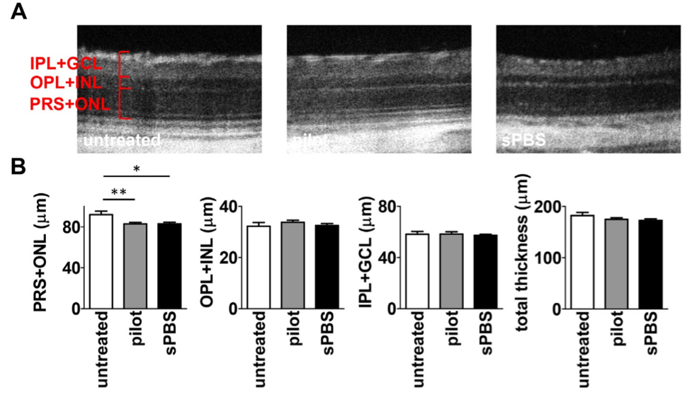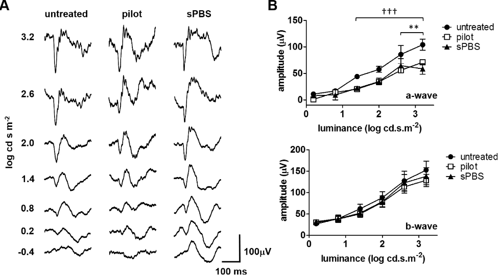 The Phoenix MICRON® focal ERG measured the electric response of the retina at the injection spot; since the focal ERG allows precise selection of stimulation area (under red illumination to maintain dark adaptation), Becker et al could identify and stimulate the injection site. The PBS-injected and pilot-injected eyes had reduced a-waves but normal b-waves (Fig 3). This aligns with the Phoenix MICRON® IV OCT findings that the photoreceptor layer was reduced.